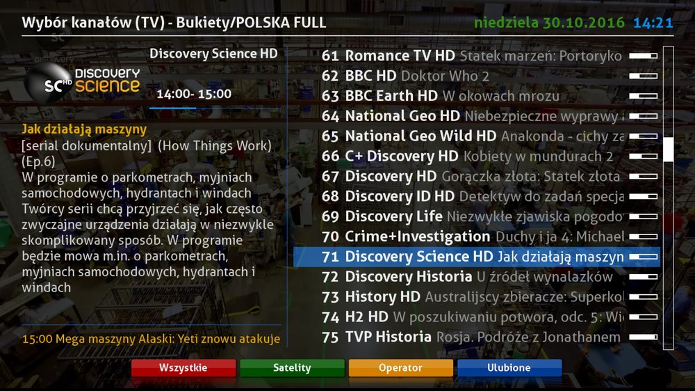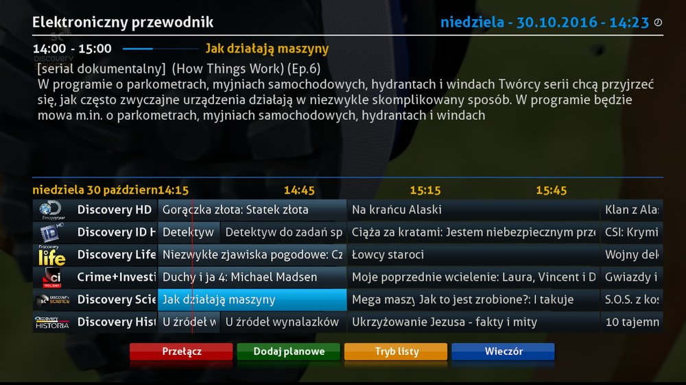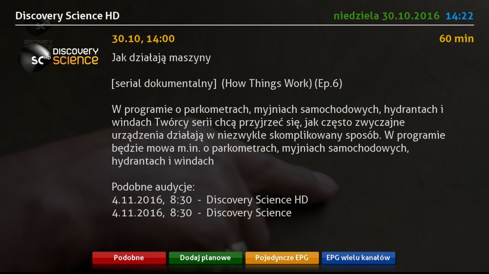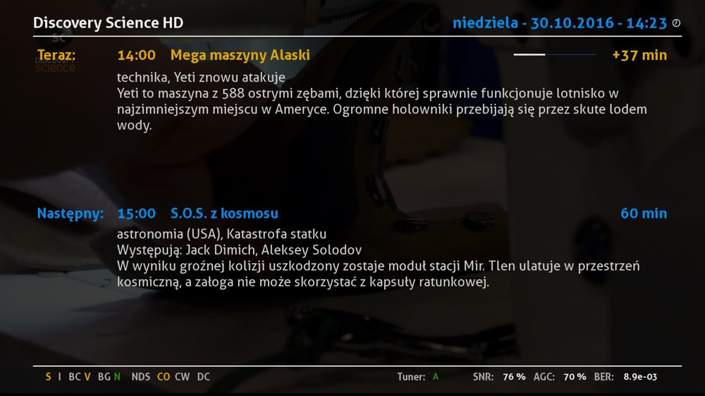 Od bardzo dawna obserwuję rozjazd w tym co podawane jest w EPG w zależności od tego w której sekcji GUI jest pokazywany opis. Na poniższym przykładzie, kanał Discovery Sience - dziś godzina 14:00. Korzystam z EPG Import - pobierana jest lista wyłącznie dla Polskich kanałów z Rytec Poland XMLTV o 07:02, dziś ręcznie pobrałem listę po skasowaniu starej o 14:18. Przed skasowaniem starego epg.dat, wyłączyłem enigmę, skasowałem epg.dat i poleciał dla pewności pełny reboot. Po wstaniu czystego systemu pobrałem ręcznie z menu pluginu. Teraz tak - jak wybiorę info oraz info info - to opis programu jest błędny, natomiast opis dostępny pod OK, OK -> info, w graficznym EPG i EPG dostępnym na www jest OK. Co jest grane - czemu raz podawany jest opis A a raz opis B, skąd one się biorą w tych sekcjach. Niedawno wspominałem ten błąd w czasie kiedy zauważyłem, że błędnie jest ustawiona domyślna strefa czasowa, ale ja u siebie mam ją już dobrze ustawioną. Zwróćcie u siebie jak macie podawane opisy i czy są prawidłowo czy jest rozjazd pomiędzy tym co okazane jest pod "OK", a tym pod "Info". EDIT: Przed chwilą sprawdziłem program na ncplus.pl i tam pokazuje, że ten błędny opis jest z programu który będzie emitowany za +1h. -