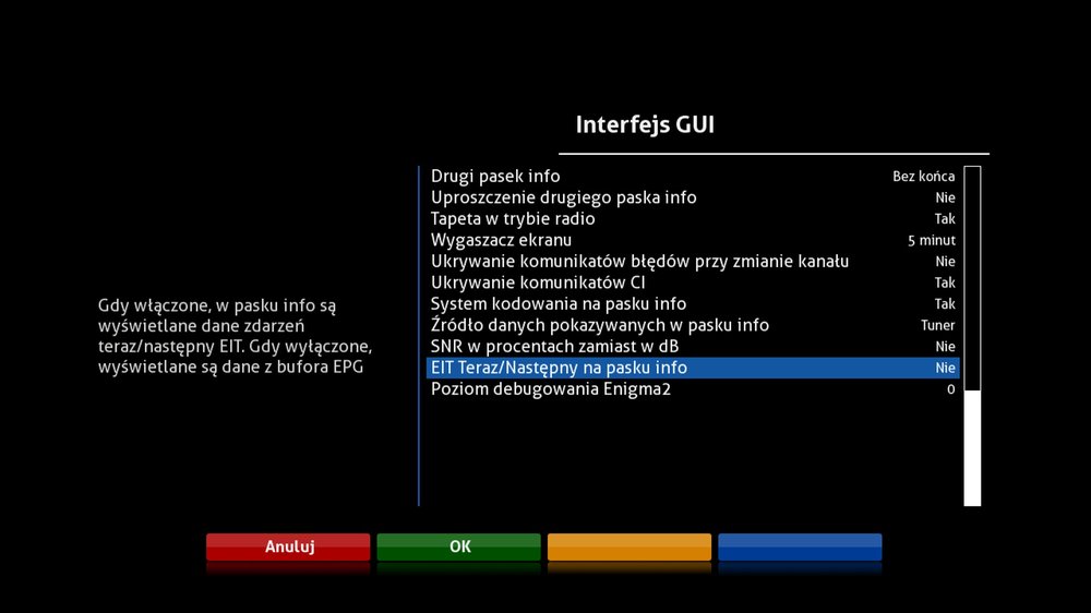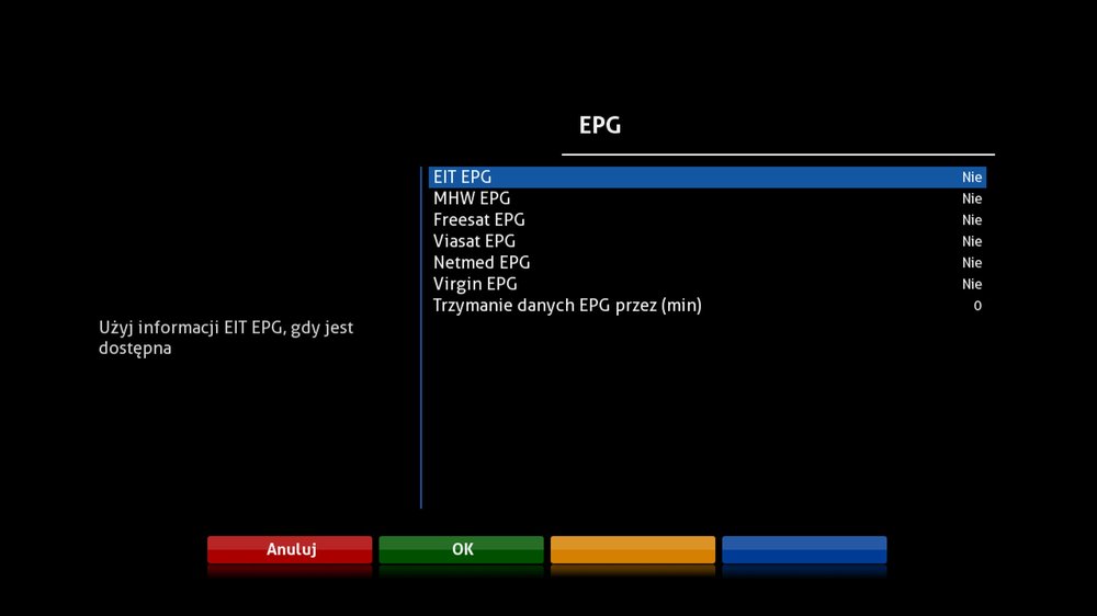 Za radą tuxa: Ubić pobieranie EPG z sat, oprzeć się tylko na danych z EPG Import. Menu -> Ustawienia -> System -> EPG: wyłączyć pobieranie wszystkich typów EPG z SAT. [attach name=EPG.jpg type=image/jpeg]16536[/attach] Menu -> Ustawienia -> System -> Interface GUI: odszukać "EIT Teraz/Następny na pasku info" - przestawić na nie. [attach name=Interface+GUI.jpg type=image/jpeg]16538[/attach] Wyłączyć enigmę, w konsoli np.: /etc/init.d/gui stop skasować epg.dat (domyślnie w /hdd) rm /hdd/epg.dat doinstalować dodatek enigma2-plugin-epgimport opkg install enigma2-plugin-epgimport i ustawić pobierania z netu opisów. Tu polecam aby mieć jakiś HDD, etc na dane epg, ponieważ pełny plik epg.dat może objętość mieć 10-12MB, czyli więcej niż możemy posiadać miejsca w flash. -