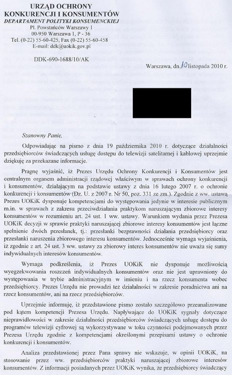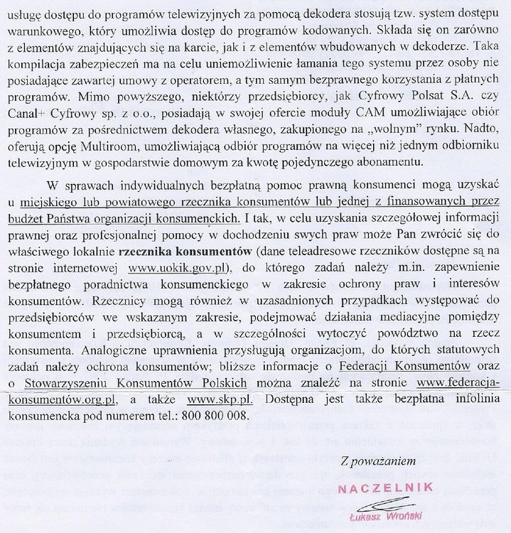 5. Panowie muszę schłodzić Wasz entuzjazm z wystąpieniem do UOKiK w sprawie limitu ECM-ów stosowanego przez operatora. W 2010 r. osobiście pisałem w sprawie parowania karty kodowej z odbiornikiem i polecam przeczytanie regulaminów operatorów. Wątpię aby pogląd Urzędu w tych kwestiach, wyrażony na drugiej stronie otrzymanej odpowiedzi, się zmienił. Wątek ten był poruszany przeze mnie na forum satkuriera, załączam link do niego. Jak dodajemy obrazki? (regulamin) Wybacz @matzg ale nie mam już skanów tych dokumentów na kompie (są z 2010 r.), skorzystałem z "umieść obrazek" dostępnym przy tworzeniu postu ze skrótem do "hostingu", a szukając w regulaminie jak się dodaje zdjęcia, fotki nie natrafiłem na wpis o dodawaniu też ich jako załączniki. Znalazłem teraz w regulaminie jako "obrazki", szukanie z przeglądarki. Coś mi tam dzwoniło, o tej formie dodawania załączników aby pozostawały dostępne na serwerze naszego forum. Pozdrawiam
