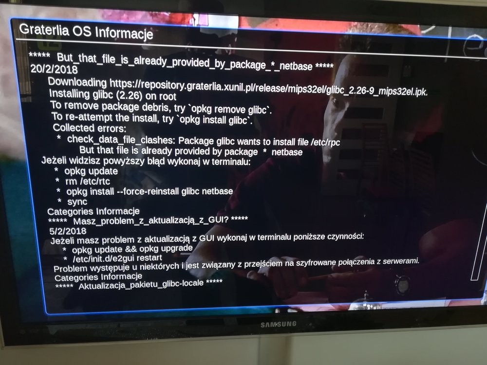 Po pierwsze zadałem pytanie w dziale: Graterlia Operating System ► Tunery ADB - niestety tam nie uzyskałem odpowiedzi. Proszę o pomoc. Od kilku dni, może nawet więcej, nie mam żadnych aktualizacji. Jedyne informacje jakie dostaję znajdują się w screenach. Czy coś muszę wykonać zrobić? czy wszystko jest ok? Wersja oprogramowania na pendrive: Graterlia OS 2018-02-17 10:19:53. (GOS_2016-09-11 - Branch: master)